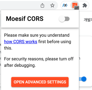 2. CORS ON -> CORS OFF ํ ๋ค์ ์๋ ์ฒดํฌ๋ฐ์ค๋ฅผ ์ฒดํฌํ๋ค.